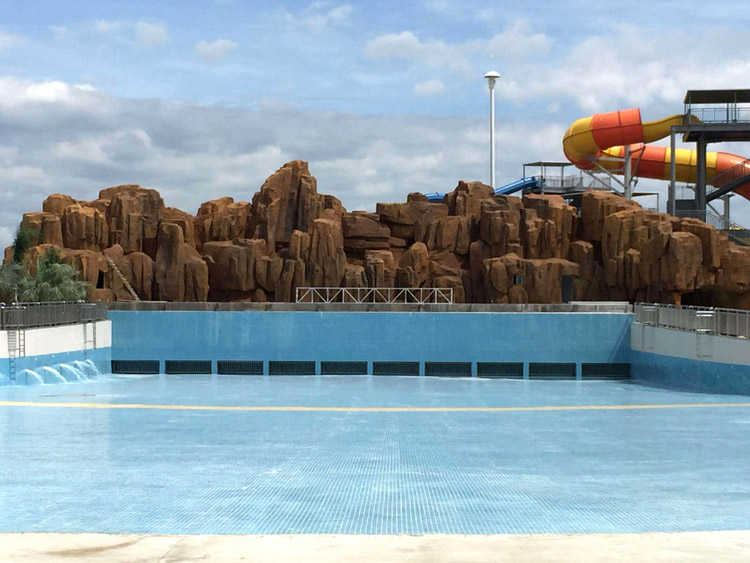 在戲水樂園中,它在所有水池里一般來說是最大的,同時也是最創造氣氛的。水面上起伏的層層波浪總是帶給游人陣陣按捺不住的激動,以致國外一些戲水樂園僅設置這樣一個大池就已使游人樂而忘返了。造浪池池底要設計成斜坡狀,由淺入深。這樣,讓游人有一個從觀浪欣賞、踏浪蹚水,最后暢游其中的過程,領略到回歸大自然的感受,并且這也有利于波浪的形成與發展。造浪機及波浪發生口要設置在水池最深處。造浪系統在運作時,其能耗較大,故通常不長時間持續造浪。一般是每小時造浪1-2次,每次10-15分鐘長。