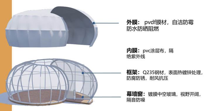 仿生造型獨特,居住體驗特別,打造網紅酒店,兼具設計感和私密性,完美融入野外,可與多種主題相結合,打造主題酒店,